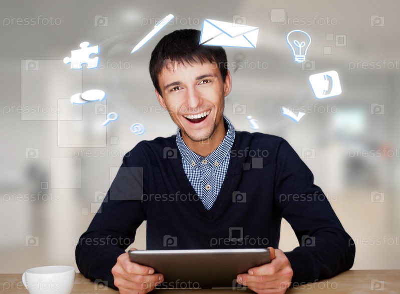 Молодой бизнесмен с различными иконками вокруг головы