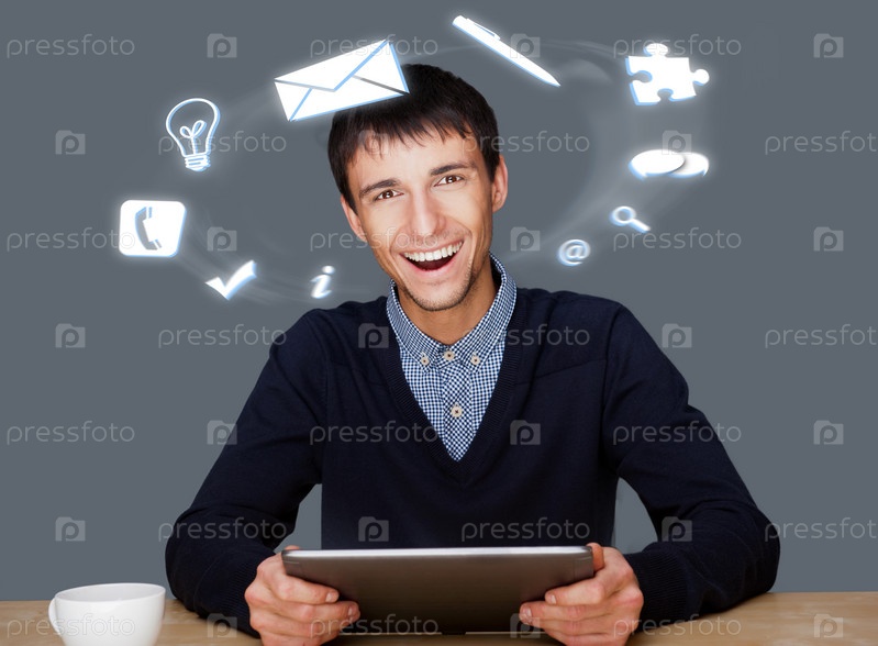Молодой бизнесмен с различными иконками вокруг головы