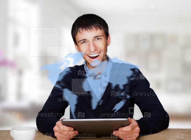 Молодой человек перед сенсорным экраном с изображением карты мира