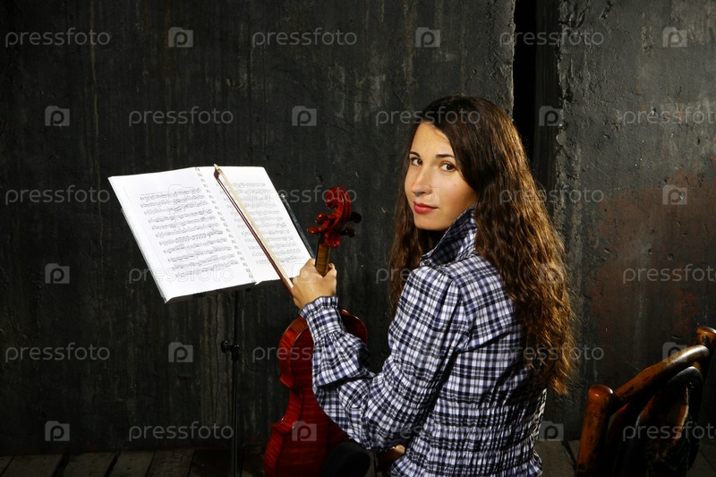 Красивая скрипач-музыкант с партитунами на стенде на черном фоне