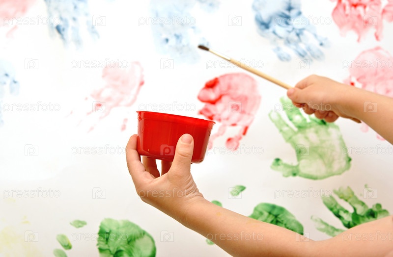 Детские руки держат кисточку и баночку с краской на белом фоне с разноцветными отпечатками рук