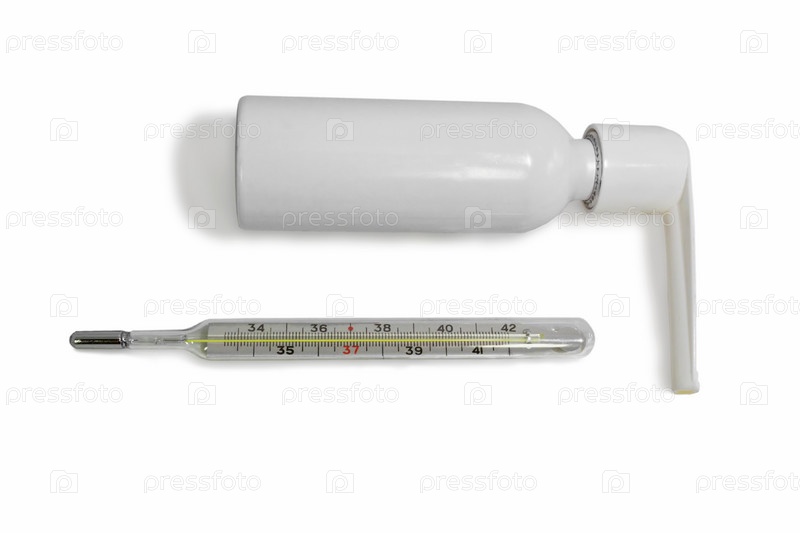 Медицинский термометр и медицинский аэрозоль на белом фоне