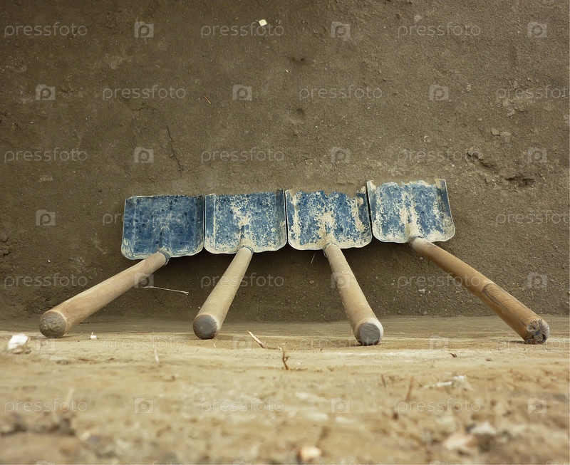 4 грязные лопаты, прислоненные к земляной стене. Вид сверху