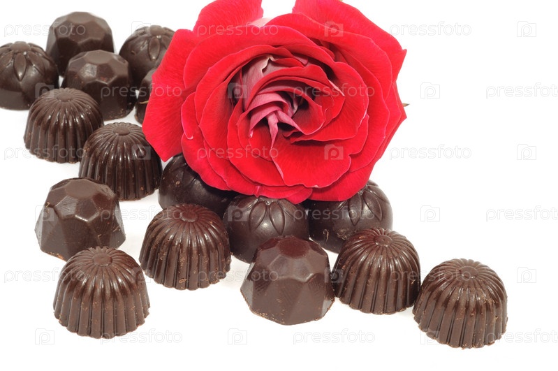 Красивая красная роза и шоколадные конфеты на белом фоне
