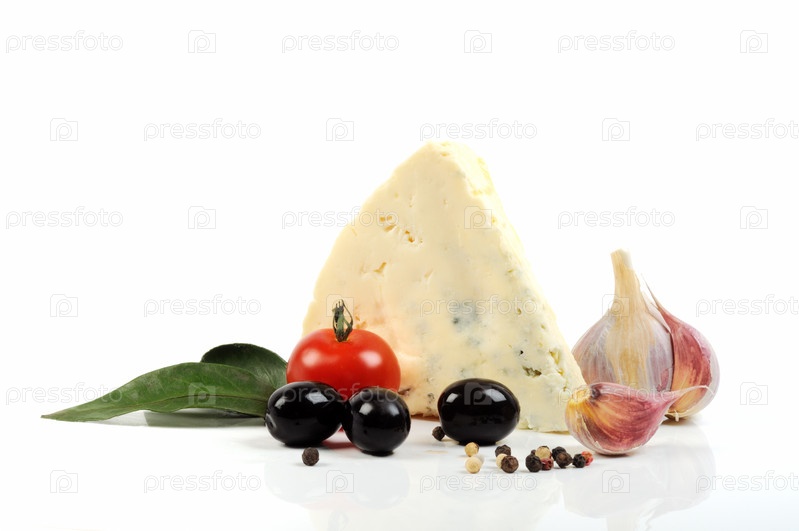 Голубой сыр, оливки и специи на белом фоне