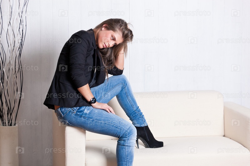 Девушка в джинсах и черном пиджаке на белом диване