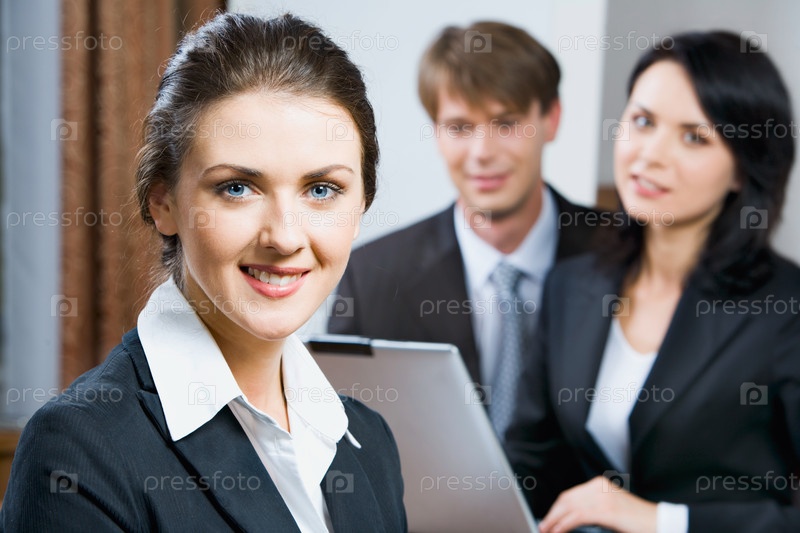 Портрет дружелюбной улыбающейся женщины на фоне ее деловой команды