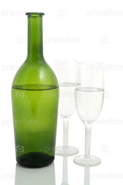 Бутылка вина и пара шампанских флейт на белом фоне