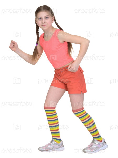 Бегущая девушка в футболке на белом фоне