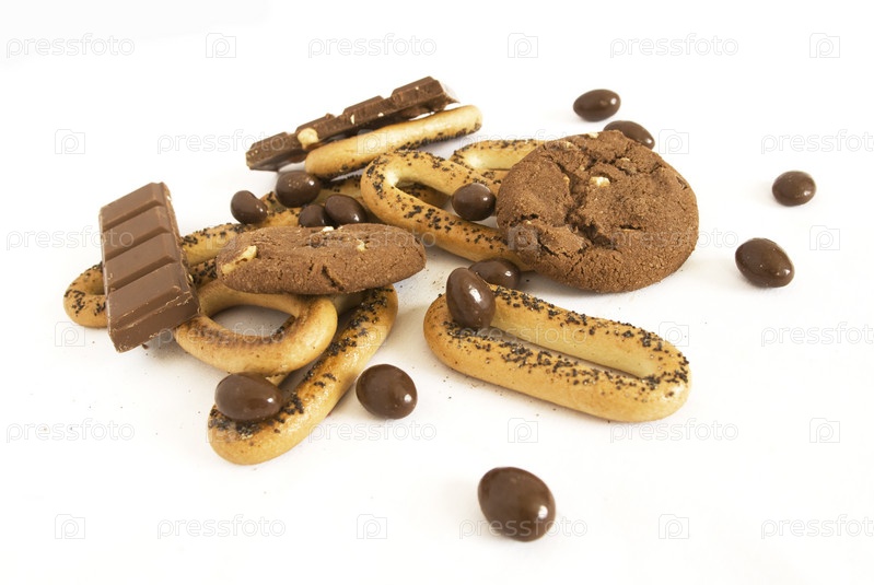 Хлебные кольца, шоколадные печенье, шоколад с орехами и миндалями открытые в шоколаде изолированы на белом фоне