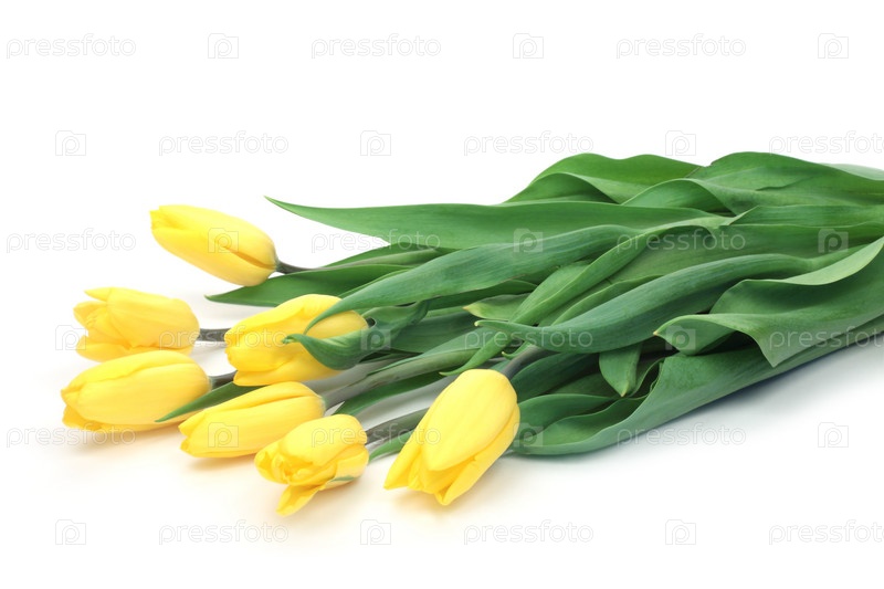 Желтые тюльпаны, лежащие на белом фоне