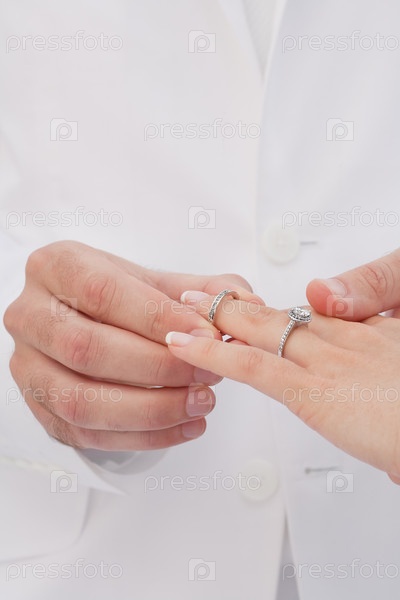 Жених надевает обручальное кольцо на палец невесты