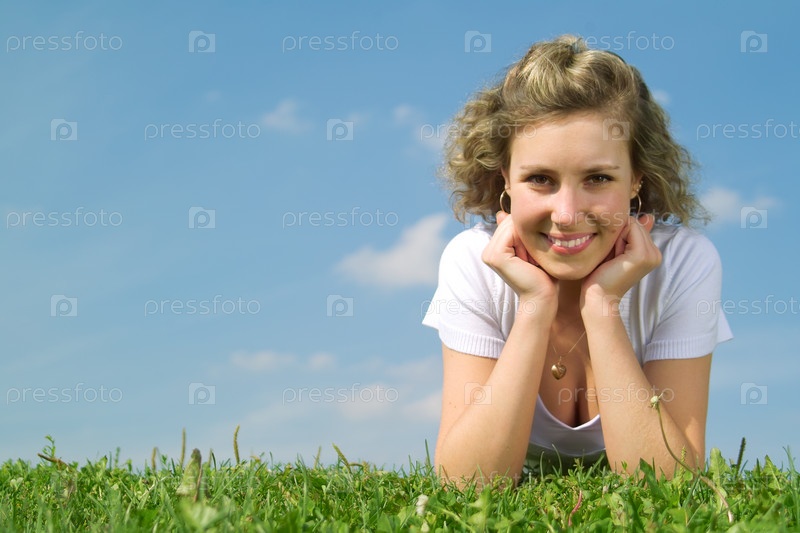 Красивая леди, сидящая на траве в солнечный день