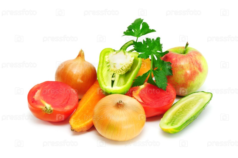 Фрукты и овощи на белом фоне