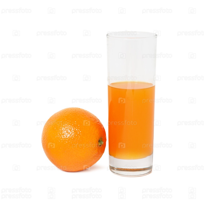Стакан сока и апельсин на белом фоне