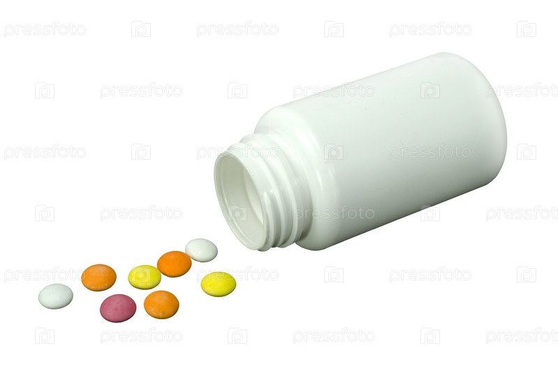 Несколько таблеток разного цвета с белой баночкой