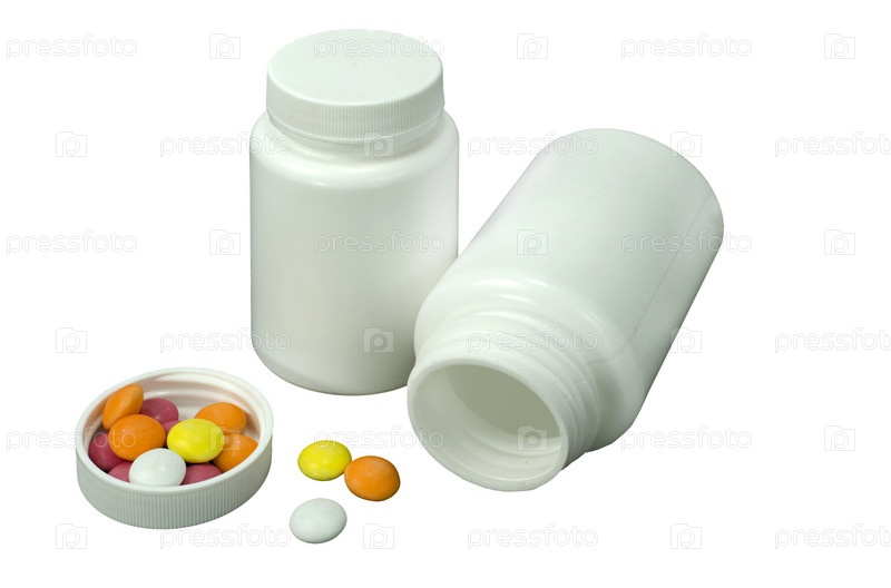 Несколько таблеток разного цвета с двумя белыми баночками