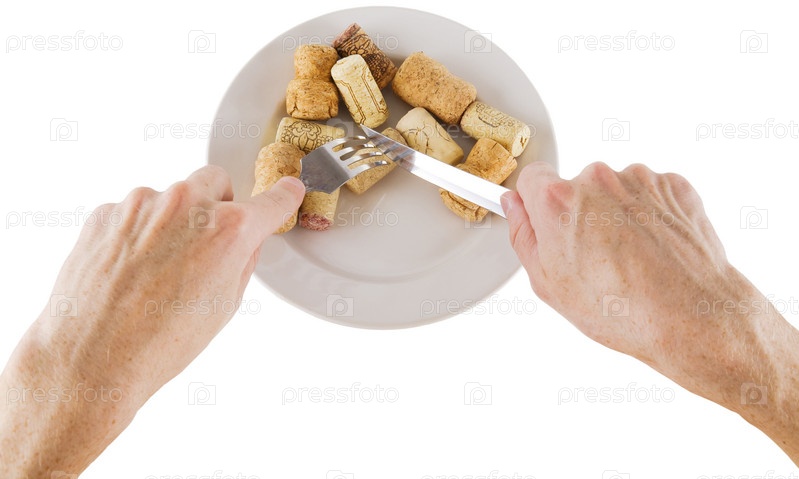 Винная пробка на белой тарелке и рука с вилкой и ножом