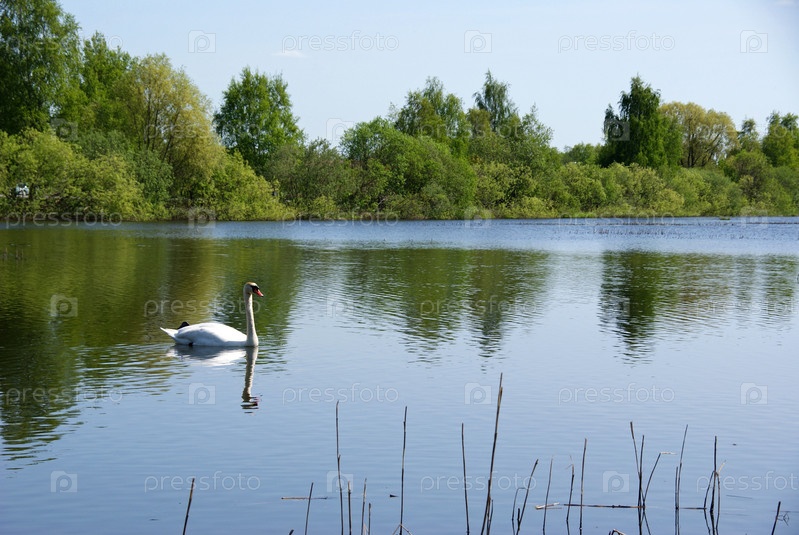 Белый лебедь плывет на середине озера