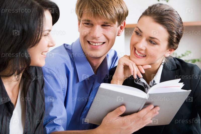 Бизнесмен, держащий блокнот между двумя женщинами
