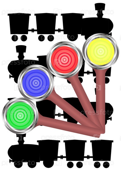 Разноцветные цвета семафора на фоне черных силуэтов паровоза