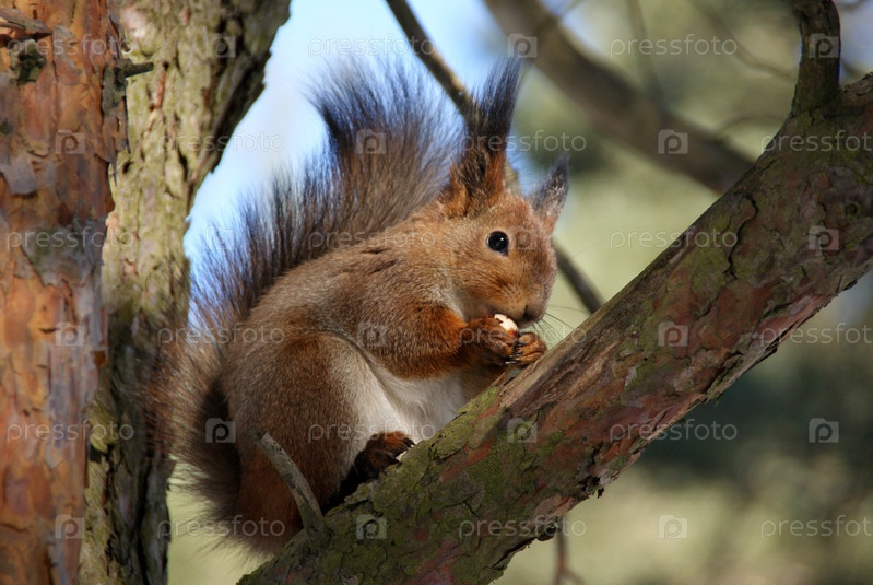 Белка на дереве с орехом