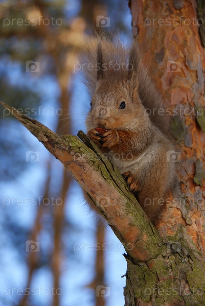 Белка с орехом на дереве