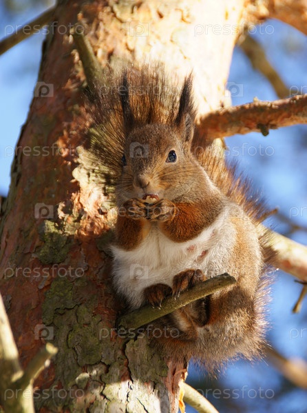 Белка с орехом на дереве