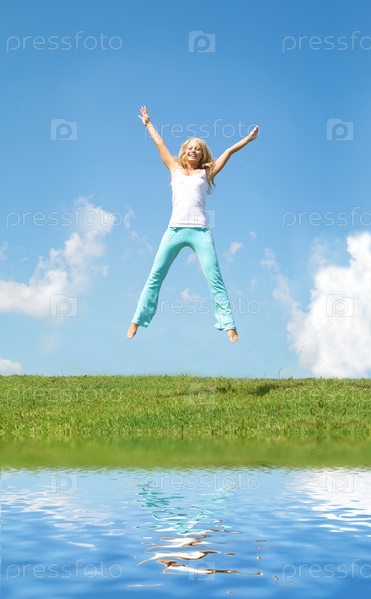 Молодая леди прыгает на фоне неба