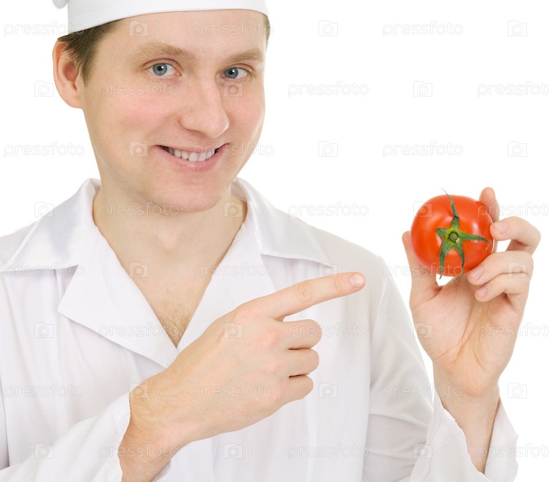 Приготовьте белый общий с томатом в руке на белом фоне