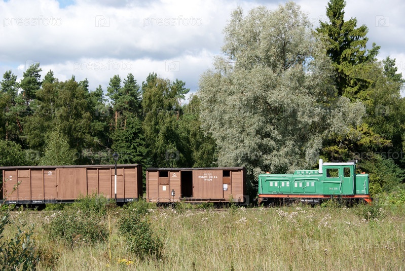 Локомотив и грузовые вагоны на фоне зеленых деревьев