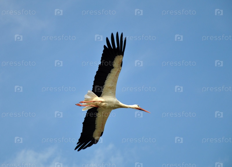 Аист летит на фоне голубого неба