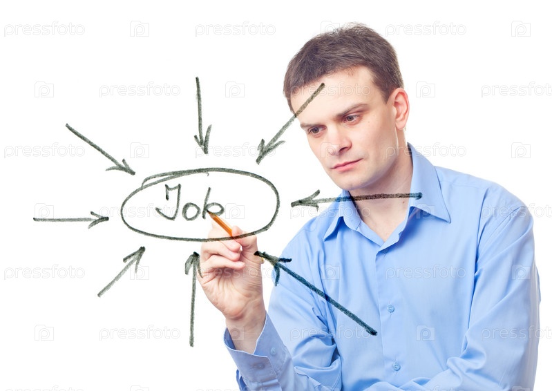 Бизнесмен пишет слово "работа" на белом фоне