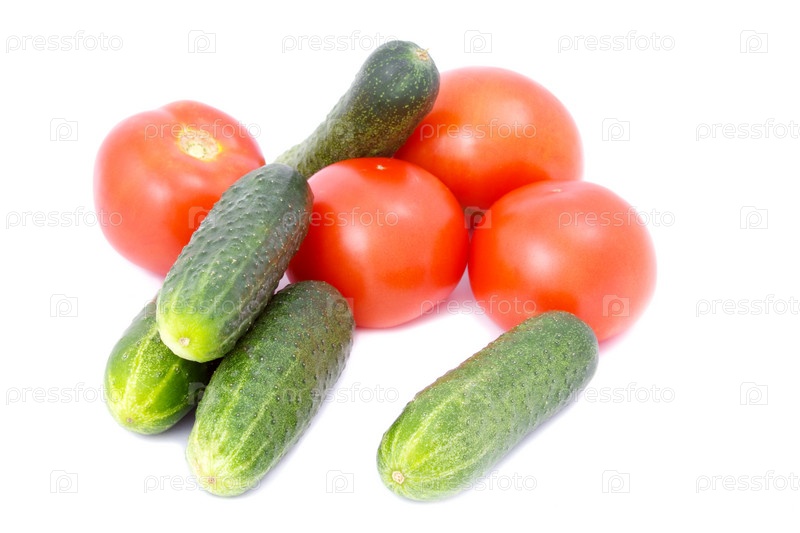 Свежие томаты и огурцы на белом фоне