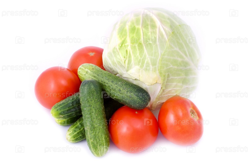 Свежие томаты, огурцы и капуста на белом фоне
