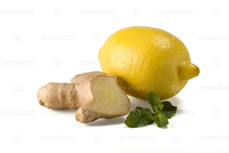 Лимон, мята и имбирь на белом фоне
