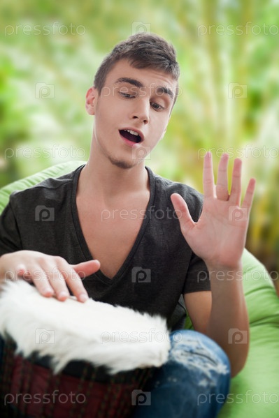 Счастливый юноша играет на барабане