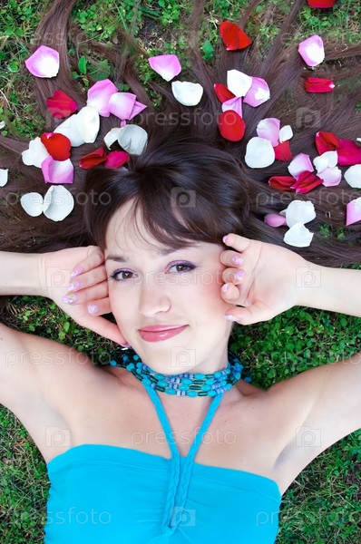 Девушка лежит на траве и смотрит в камеру
