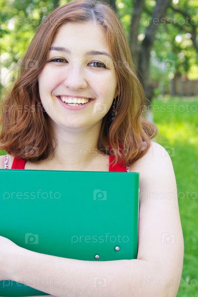 Девушка стоит с папкой в руках на природе