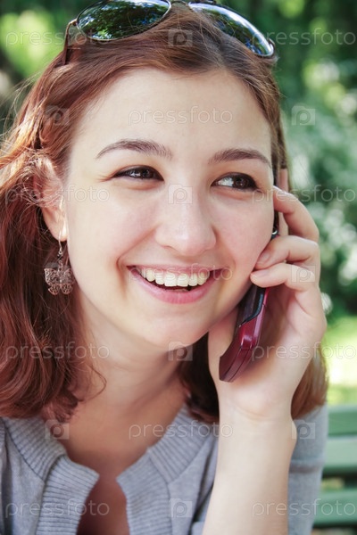 Улыбающаяся девушка с телефоном на фоне деревьев