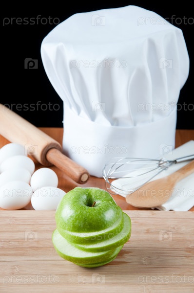 Нарезанное свежее зеленое яблоко, поварской колпак и кухонная утварь