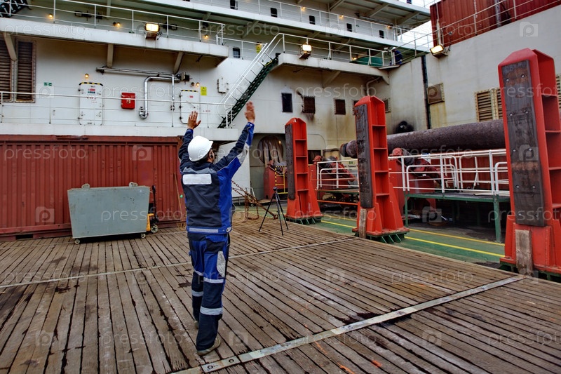 Работник показывает куда опустить груз