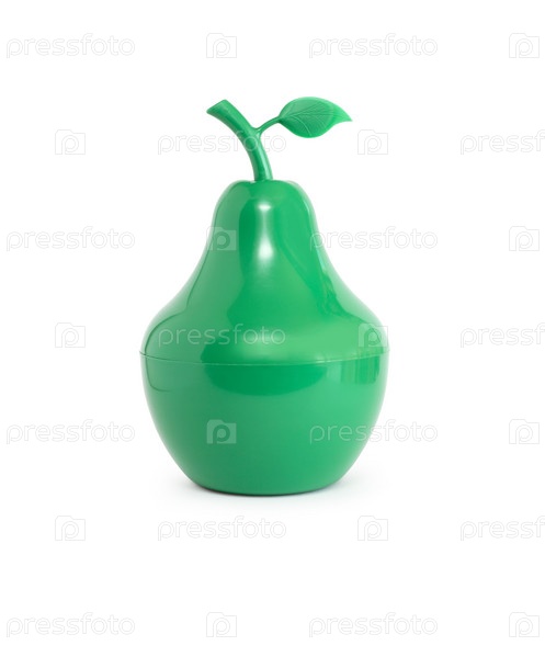 Зеленый пластиковый контейнер в форме груши на белом фоне