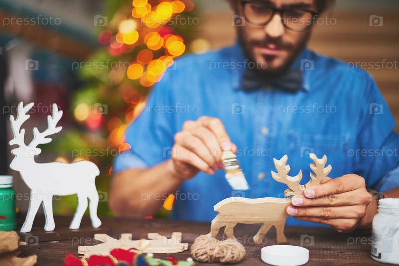 Мужчина раскрашивает деревянных оленей