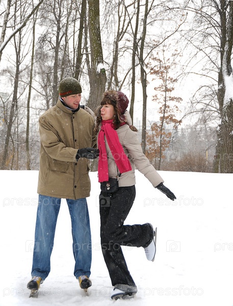 Молодая пара катается на коньках