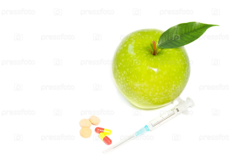 Спелое яблоко, таблетки и шприц на белом фоне