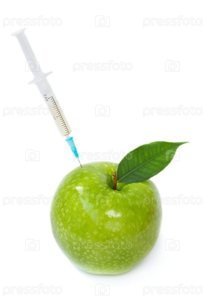 Спелое яблоко и шприц на белом фоне