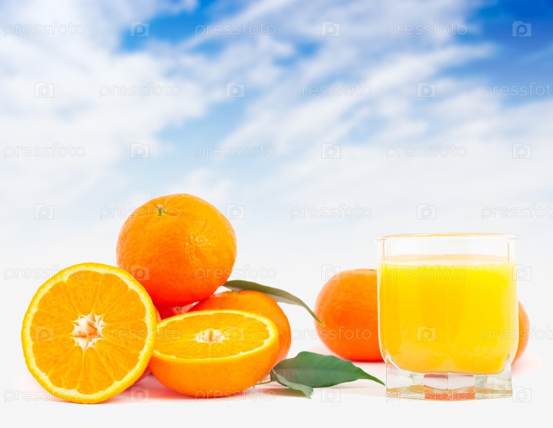 Свежий апельсиновый сок и апельсины на светлом фоне
