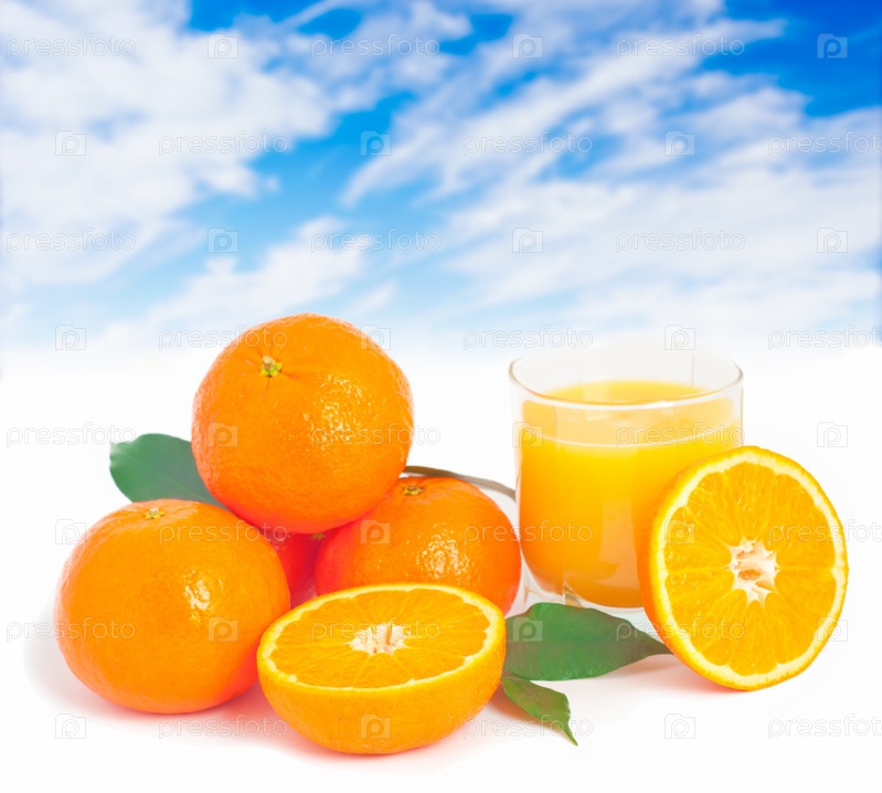 Свежий апельсиновый сок и апельсины на светлом фоне