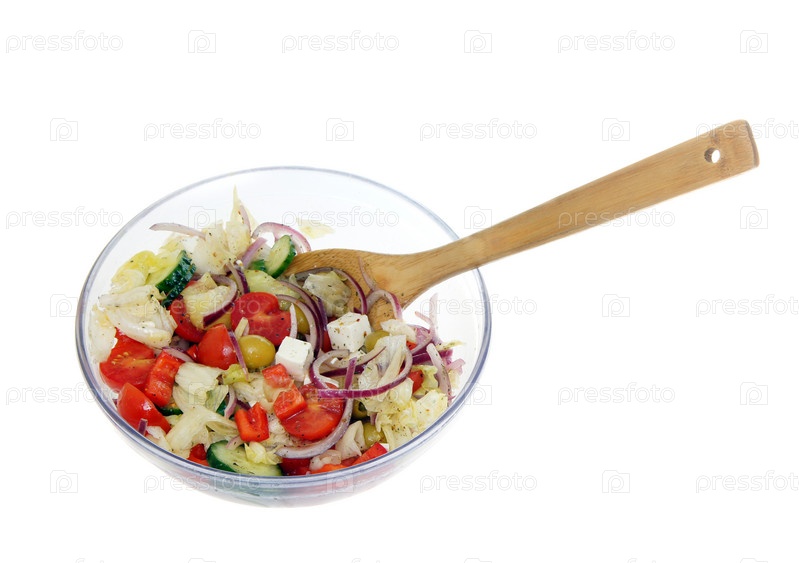 Салат из свежих овощей в стеклянной тарелке, изолированный на белом